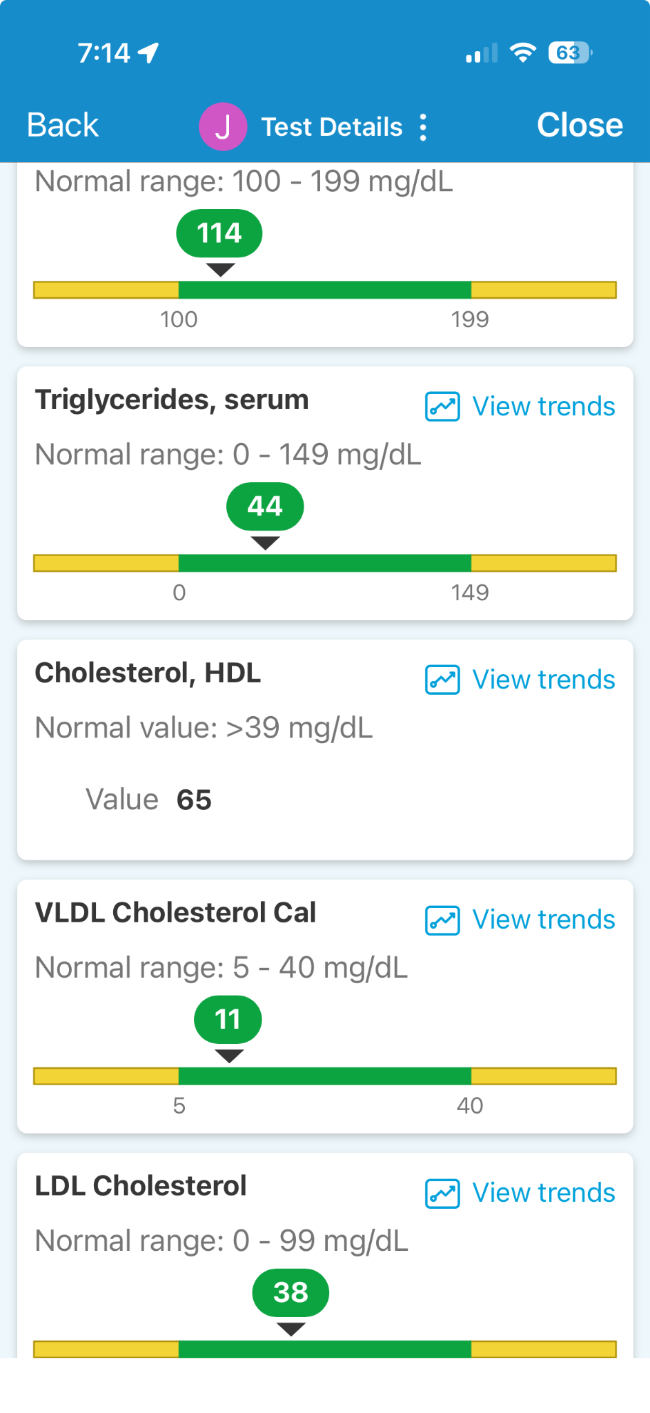 In this lab report, everything is in the green “normal” zone, but this should not be confused with “safe”. In this case, the LDL level is 38, which is unusually low, but this person is taking medications to reduce their LDL levels because they are aware that risk rises with higher levels.